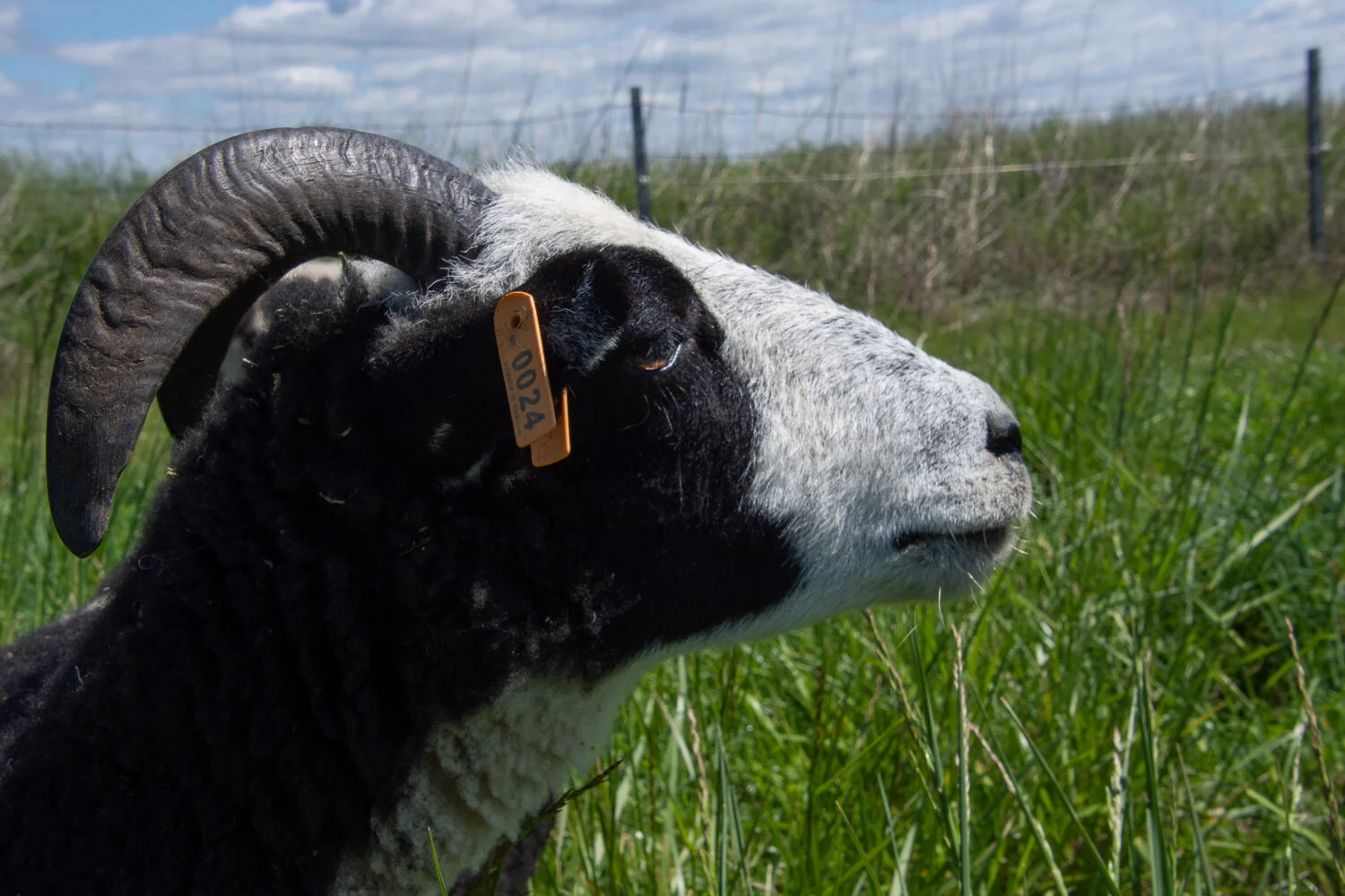 Ram lamb #2030. I always think it is cute when these ram lambs have tufts of hair at the end of their horns.